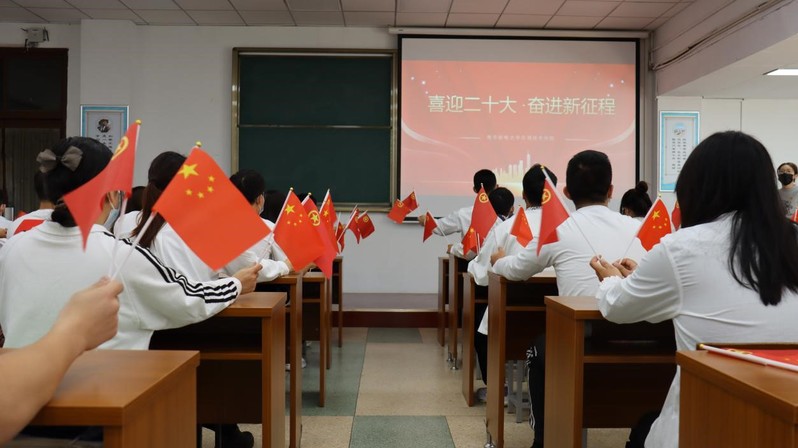 中国共产党第二十次全国代表大会是在迈上全面建设社会主义现代化国家新征程、向第二个百年奋斗目标进军的关键时刻召开的一次十分重要的大会。党员们聚精会神地观看,认真聆听习近平总书记的重要讲话,不时鼓掌,时摇曳手中的党旗、团旗和国旗。
