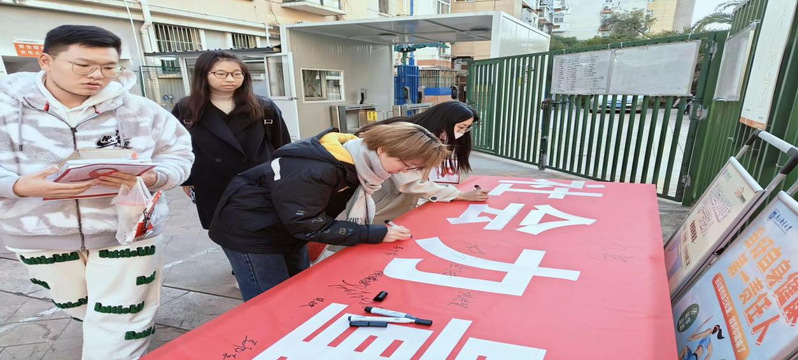 12月1日,“携手遏制艾滋,共建和谐校园”主题宣传活动在锁金村校区员工宿舍区举行。工作人员在现场向同学们讲解艾滋病相关知识,与同学们交流,并发放艾滋病宣传卡片。通过讲解,同学们更加深入地了解艾滋病的相关知识,包括艾滋病的危害、传播途径、预防方法等。这不仅可以帮助同学们将保护自己的行为意识落实到行动中,还可以让他们更加理性地看待艾滋病,消除对患者的歧视和偏见。同学们纷纷在艾滋病宣传横幅上签字,展现了同学们对抗击艾滋病的勇气和决心,表明了他们愿意为了预防艾滋病、维护身体健康和生命安全而努力奋斗的信心。
