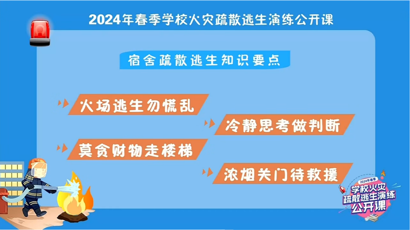 此次公开课由中国消防微信公众号精心策划,旨在通过直播形式,向广大师生普及火灾疏散逃生的基本知识和技巧。课程内容涵盖了火灾报警、现场逃生方法、遇险急救措施以及消防器材的正确使用等多个方面,对于提高同学们的消防安全意识和自救能力具有重要意义。