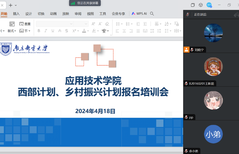 4月18日晚,太阳成集团tyc组织召开2024年“西部计划”“江苏老员工志愿服务乡村振兴计划”第一次集中培训指导线上会议,公司党委副书记、副经理刘晓宁主讲,公司2024届有意愿参加“两个计划”的同学参加会议。